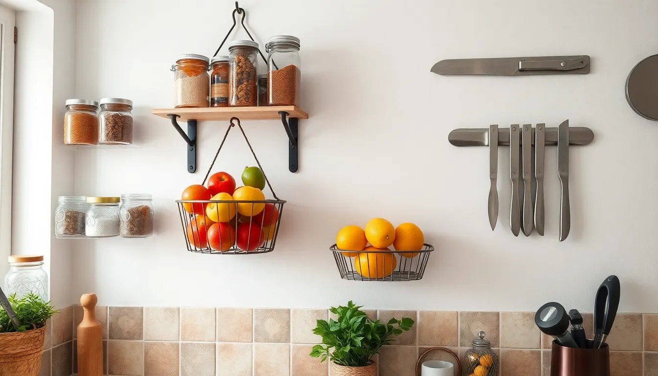 Maximizing vertical space enhances kitchen efficiency. Wall-mounted shelves and pegboards store utensils and spices, keeping them within reach. Hanging baskets can organize fruits and vegetables while freeing counter space. Magnetic strips hold knives or metal utensils, keeping them visible and accessible. Stacking containers or using tiered shelves optimizes cabinet space, showcasing items neatly. Rack systems provide additional storage for pots and pans, ensuring easy access during cooking. By implementing these ideas, individuals create a visually appealing and practical kitchen layout.