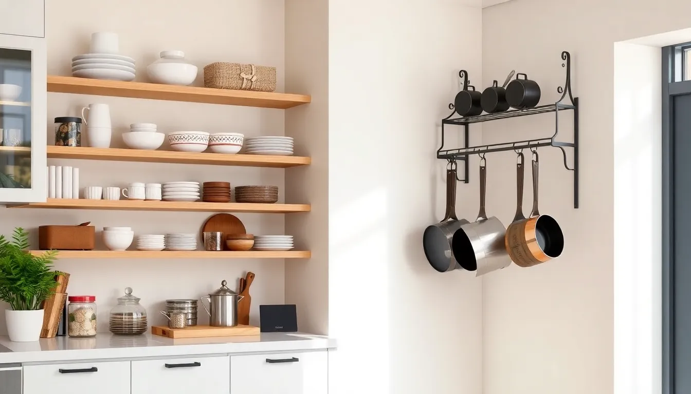 Ceiling space often goes unused in kitchens. Installing hanging pot racks transforms that space into a practical storage solution. This method not only saves cabinet space but also adds visual appeal. Overhead storage can accommodate pots, pans, and other kitchen tools, keeping them within easy reach. Unique solutions like floating shelves or hooks can display decorative items while maintaining functionality. Utilizing the ceiling area enhances storage options and elevates kitchen design effortlessly.